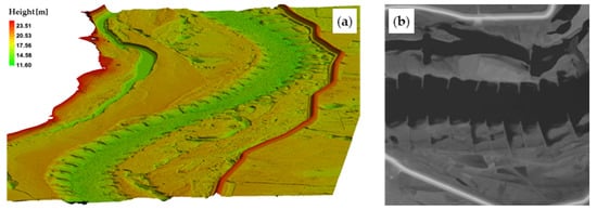 (a) Digital elevation model including Oder River bathymetry (WSA Oder–Havel). (b) LiDAR data with recording of flow control structures (RZGW Szczecin).