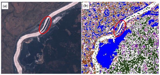 (a) Sentinel-2 image recorded on 3rd of March 2018. (b) Classified Sentinel-1 radar image recorded one day later in the same area. Classes that were associated with ice cover along the river are shown in white, classes associated with a free water surface are shown in blue. The ice-free area is also visible in the radar images (red ellipses).