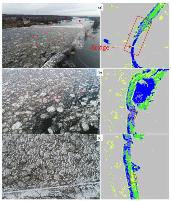 Comparison of UAV images and classified Sentinel-1 grid data. Red rectangles visualize the picture details on the left. (a) Transition of the open water surface (blue values for open water clusters) north of Hohenwutzen Bridge (Germany) towards the consolidated ice cover formed by a juxtaposed formation of pancake ice floes (purple and green cluster values). (b) Loose formation of pancake ice floes (purple cluster value) at the height of Bielinek. (c) Consolidated and tilted ice floe formation at the height of Lunow (yellow cluster value).