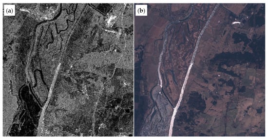 (a) Sentinel-1 radar image taken on 1st of March 2018 and (b) Sentinel-2 image taken on 3rd of March 2018 of the initial ice-jam location near Marwice (Poland).