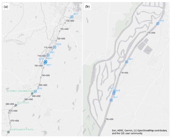 (a) Initial ice-jam locations between 2016 and 2021, which could be determined from the Sentinel data. (b) Magnification of the Oder section with a noticeable accumulation of initial ice-jam locations.