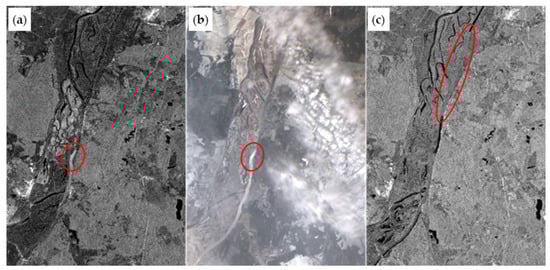Sentinel-1 and Sentinel-2 images of the ice-jam events in December 2022. The red ellipses mark the area of the ice-jam locations (a) Sentinel-1 and (b) Sentinel-2 image taken on 17 December. (c) Sentinel-1 image taken on 20 December.