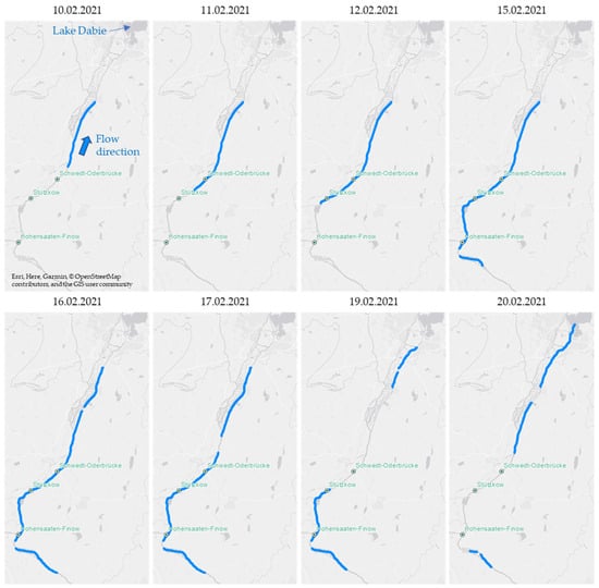 With the combined and evaluated data of Sentinel missions 1 and 2, documentation of the spatiotemporal evolution of the ice cover on the Oder River was generated for the ice-jam events in March 2018 (graphic in Supplementary Materials), as well as February 2021 (Figure 15). Such observations, in which the progression or persistence of the ice cover can be investigated, contribute to a comprehensive understanding of river ice dynamics in the study area and facilitate the localization of segments with a noticeable interference on ice-jam events. The monitoring of the intra-annual ice cover development is described in the following.