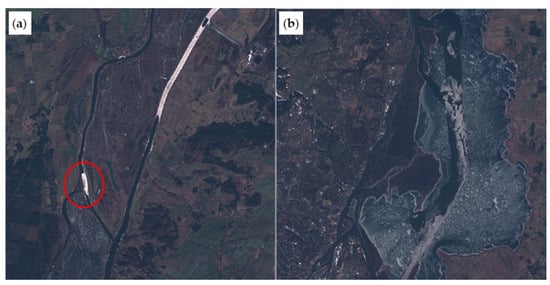 (a) Ice displacement on the West Oder (red circle) discovered using Sentinel-2 image supporting ice-breakup operations during the 2021 ice-jam event. (b) Sentinel-2 image showing ice floe transport channel on Dabie Lake on 22 February 2021.
