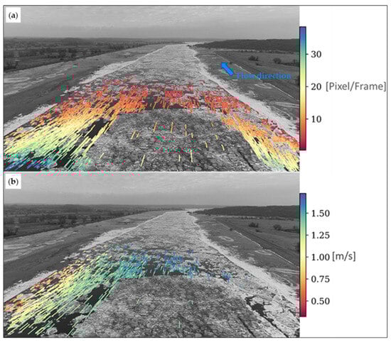 Particle tracking velocimetry measurements derived from UAV images during the ice run on 19 February 2021. (a) Ice floe velocities given in pixel per frame within the image space. (b) Ice floe velocities converted into meters per second using ground control points and water level information.