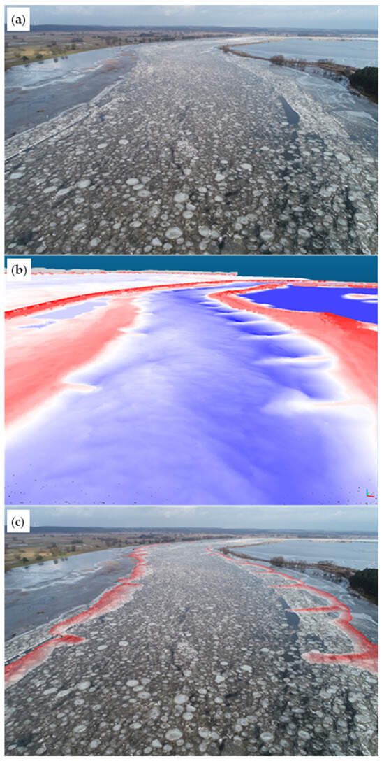 Graphical method for overlaying UAV images and the digital elevation model of the Oder River to investigate the interaction between flow control structures and ice cover. (a) UAV image of the ice-jam at the height of Bielinek in February 2021. (b) Angular view of the Oder River DEM with matching camera pose and field of view as UAV image. (c) Resulting superposition of (a,b) giving the possibility of localizing the groins and investigating potential interactions.