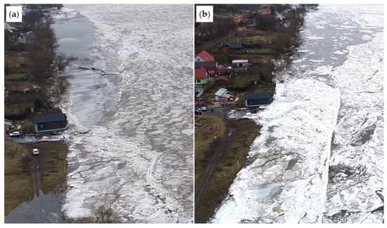 UAV images taken on 19 February at the height of Bielinek. (a) Area of the old ferry pier before the ice run. (b) Area of the old ferry pier during the ice run.