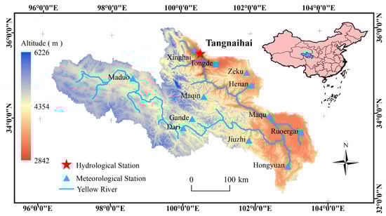 The source region of the Yellow River (SRYR) encompasses the area of the SRYR located above the Tangnaihai hydrological station (32°9′~36°2′ N, 95°59′~103°34′ E) in the northeastern portion of the Tibetan Plateau. Within the SRYR, there are twelve meteorological stations (Maduo, Dari, Gande, Jiuzhi, Hongyuan, Ruoergai, Maqu, Henan, Maqin, Zeku, Tongde, and Xinghai), as shown in Figure 1. The river length in the SRYR measures 1553 km, accounting for 28.4% of the total length of the Yellow River [46]. Encompassing 124,000 km2, the source area exhibits elevations ranging from 2842 to 6226 m. The terrain is characterized by higher elevations in the west and south, transitioning to lower elevations in the east and north. The climate is classified as inland alpine humid or semi-humid, with temperatures ranging from −4 to 5 °C and daily averages exceeding 0 °C between May and September. Annual precipitation averages between 220 and 780 mm, with significant interannual variability; precipitation distribution throughout the year is uneven. Both temperature and precipitation exhibit a gradual decrease from southeast to northwest. Overall, the region typically encounters dry winters, spring droughts, and intense precipitation events during summer and autumn (June to September).