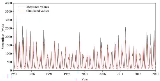 The study employed a temporal resolution of 3 h and a spatial resolution of 500 m. The calibration period was from 1 January 1981 to 31 December 2010 and the validation period was from 1 January 2011 to 31 December 2020. On a monthly scale, both the calibration period’s NSE and R2 exceed 0.84, while during the validation period, both NSE and R2 are greater than 0.75. On a daily scale, both NSE and R2 are above 0.79 during the calibration period, and both NSE and R2 are greater than 0.72 during the validation period. The RSR stayed below 0.45 in calibration, while the maximum value was 0.51 in validation.