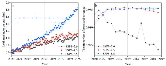Grassland surface area and grassland growth in the SRYR, 2020–2099. (a) Growth on grasslands based on leaf area index. (b) The proportion of grassland coverage in the SRYR. The vertical lines in each plot mark the year 2059.