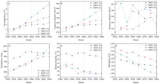 Average meteorological element change per decade for SRYR from 2020 to 2099. (a) Air temperature; (b) longwave radiation; (c) shortwave radiation; (d) precipitation; (e) relative humidity; (f) wind speed. The vertical lines in each plot mark the period 2060s.