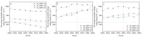 The average streamflow changes per decade from 2020 to 2099 in the three scenarios of S1, S2 and S3 in the SRYR. (a) Scenario S1. (b) Scenario S2. (c) Scenario S3.