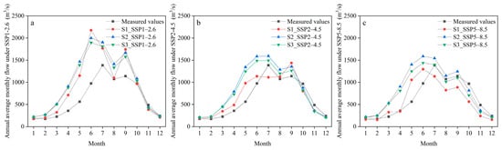 The annual average monthly flow of observed flow for the historical period from 1981 to 2020 is calculated. The multi-year average monthly flow for the three scenarios (S1, S2, and S3) from 2020 to 2099 is plotted, as shown in Figure 6.
