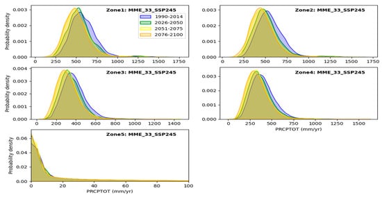 In this section, a comparison of kernel density distributions (KDDs) is performed for the three future periods under the SSP245 and SSP585 scenarios compared to the historical period, for each extreme precipitation index. The comparison is conducted for each zone using the multi-model ensemble MME-33 simultaneously. However, figures showing the comparison of probability densities for each individual model are aggregated in Supplementary Materials S2 in the form of an HTML page.