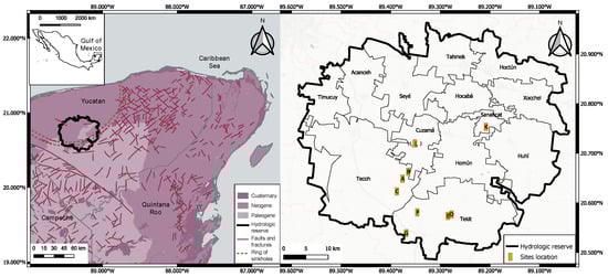 Refs. [,,] were the first to propose a hydrogeological reserve area at the west of Mérida City, but the proposal was not a decree. Ref. [] proposed a reserve area with the results of the project funded by a CONACYT grant. In order to protect and ensure the drinking water supply for Yucatán State, the reserve area proposed was extended and decreed by the Government of the State of Yucatán in 2013, published in the Official Gazette as a geohydrological reserve of the Ring of Sinkholes [].