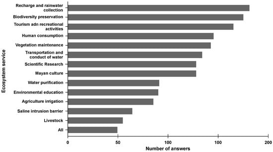 Figure 2 shows answers of almost 300 persons interviewed. It is important to highlight that most participants knew the sinkholes or had visited them before and they could choose more than one option. Participants consider water recharge and rainwater collection as the most important and biodiversity conservation in second place. Even if livestock is a main activity in the region, the ecosystem service appears in last place.