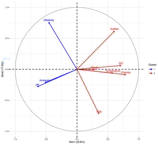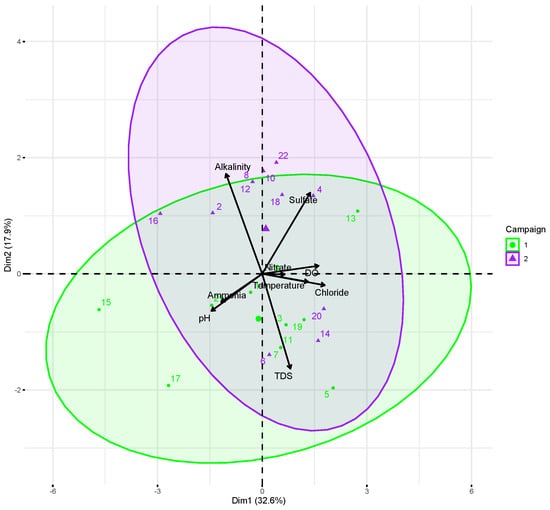 Figure 4 shows the classification by fieldwork campaign (green and purple) and the corresponding projections on the first principal component. Campaign 1 (May 2015) is influenced by almost all the variables and campaign 2 (May 2016) is strongly influenced by alkalinity and TDS. Moreover, in campaign 1, sinkholes 15 and 17 show up, influenced by pH and ammonia projections, both sinkholes located in the same municipality (Cuzamá). Sinkholes 10 (E) and 22 (K) stand out in campaign 2, by alkalinity and sulfate projection, located in different municipalities (Tekit and Sanahcat). Campaign 1 lies entirely on the negative side of principle component 2, with the exception of sample 13 (Figure 4). In terms of direction, this would probably be attributed to the variables ammonia, pH and TDS.