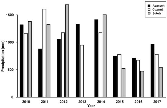 Precipitation data between 2010 and 2017 are shown in Figure 5, at three different meteorological stations near the geohydrological reserve area, Acanceh (north), Cuzamá (center) and Sotuta (south), from meteorological stations of the CONAGUA. A gradient is observed with eight years mean annual average precipitation data, 1062.0 mm (Acanceh), 1027.9 mm (Cuzamá) and 971.3 mm (Sotuta). In 2014, one year before sampling campaigns of the study, high precipitations were presented in the region. A widespread precipitation condition has been present since 2012, with high water recharge and groundwater dilution. A dry period began in 2015, finishing in 2017, from which the differences between the two seasons may be due to lower recharge and concentration of minerals in the groundwater. Ref. [] suggested that the recharge area was not only regulated by both the dissolution and precipitation of minerals. It seems that precipitation conditions caused lower ecosystem service quality in 2015 (yellow), compared to 2016 conditions (green) for water consumption and for aquatic life protection as presented in Table 5.