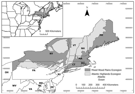 Environmental Protection Agency (EPA) Level II Ecoregions [37] (Atlantic Highlands, Mixed Woods) in the northeastern United States (source: https://www.epa.gov/eco-research/ecoregions-north-america; accessed on 27 January 2022). State abbreviations: Connecticut (CT), Delaware (DE), Maine (ME), Maryland (MD), Massachusetts (MA), New Hampshire (NH), New Jersey (NJ), New York (NY), Ohio (OH), Pennsylvania (PA), Rhode Island (RI), Vermont (VT), Virginia (VA), West Virginia (WV), District of Columbia (DC).