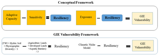 Vulnerability can be defined as the degree to which a system is susceptible to, and unable to cope with, the combined effects of climate change and anthropogenic modifications [33]. Magness et al. [34] calculated vulnerability by combining estimates of exposure, system sensitivity, and the adaptive capacity of the system. Exposure is estimated by quantifying factors attributable to climate change, such as changes in air temperature and precipitation [34,35]. Factors that affect a system’s survival, persistence, fitness, or regeneration, such as land use, provide an aggregated estimate of sensitivity. Factors that promote adaptation responses, such as protected areas managed for conservation that can sustain ecosystem integrity, provide an aggregated estimate of adaptive capacity [34]. Within this framework, system vulnerability is estimated spatially by summing data layers representing the variables contributing to exposure, adaptive capacity, and sensitivity into a relative vulnerability score. This approach to estimating vulnerability provides a systematic and hypothesis-driven framework to examine factors influencing GIEs’ potential vulnerability.