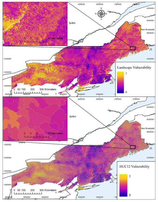 Estimated 30 m pixel and Hydrologic Unit Code (HUC) 12 watershed vulnerability across the northeastern United States study area (Figure 1). Grey lines in the lower frame indicate HUC12 watershed boundaries.