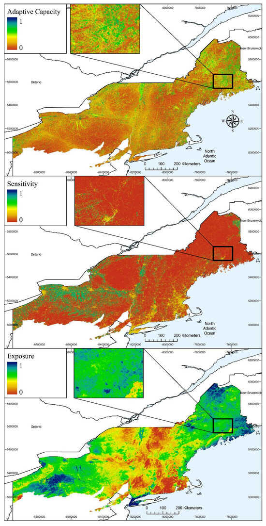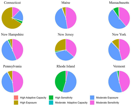 Areas (km2) predicted to be highly vulnerable (≥0.75) owing to adaptive capacity, sensitivity (land use) and exposure (climate) within the study region (Figure 1). Variables combined to estimate adaptive capacity, sensitivity, and exposure are indicated in Table 1. The conceptual framework for the vulnerability [34] score is provided in Figure 2. State abbreviations: Connecticut (CT), Maine (ME), Massachusetts (MA), New Hampshire (NH), New Jersey (NJ), New York (NY), Pennsylvania (PA), Rhode Island (RI), Vermont (VT).