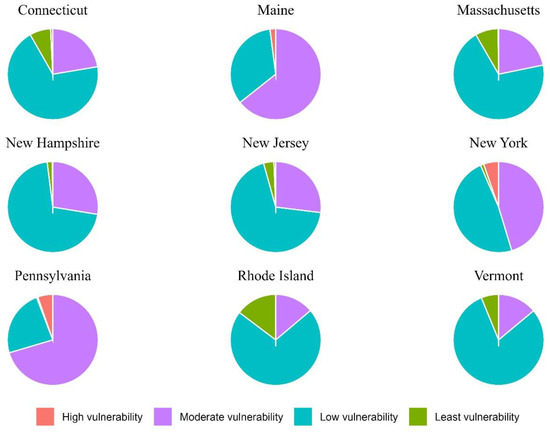 Proportion of land area vulnerability predicted in 30 m pixels summarized by states in the study area’s Environmental Protection Agency (EPA) Level II Ecoregions (Atlantic Highlands, Mixed Woods) in the northeastern United States. EPA A Level III ecoregions in the study area are indicated in Figure 1. Values used to create pie charts can be found in Table 6.