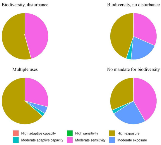 Proportion of the study area predicted to be highly vulnerable (≥0.75) owing to adaptive capacity, sensitivity (indicated by land use), and exposure (indicated by climate) within the Protected Areas Database for the United States (PAD-US), summarized by management type. High adaptive capacity does not appear on any pie charts because estimates are low or are 0 for those categories Management types: (1) managed for biodiversity—disturbance events proceed or are mimicked, (2) managed for biodiversity—disturbance events suppressed, (3) managed for multiple uses—subject to extractive (e.g., mining or logging) or OHV use, and (4) no known mandate for biodiversity protection (PAD-US Source: https://www.sciencebase.gov/catalog/item/602ffe50d34eb1203115c7ab). Values used to create pie charts can be found in Table 12. Variables combined to estimate sensitivity and exposure are indicated in Table 1.