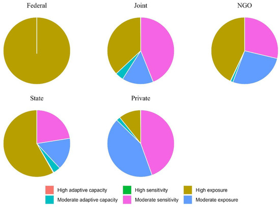 Proportion of the study area predicted to be highly vulnerable (≥0.75) owing to adaptive capacity, sensitivity (indicated by land use), and exposure (indicated by climate) within the Protected Areas Database for the United States (PAD-US), summarized by land ownership type. High adaptive capacity and High sensitivity do not appear on any pie charts because estimates are low or are 0 for those categories. Ownership types are described in the Protected Areas Database for the United States (PAD-US; https://www.usgs.gov/core-science-systems/science-analytics-and-synthesis/gap/science/protected-areas). Non-Governmental Organization (NGO). Values used to create pie charts can be found in Table 13. Variables combined to estimate sensitivity and exposure are indicated in Table 1.
