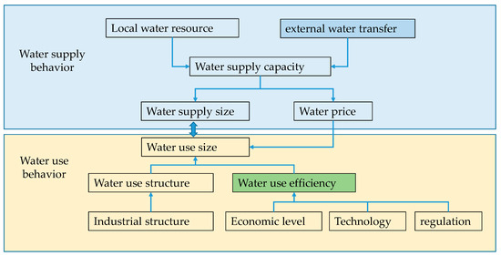Water-use efficiency, defined as the quantity of water consumed per unit of gross domestic product (GDP), serves as a metric that effectively gauges magnitude and efficacy of water utilization in economic growth [22,23]. Typically, water-use efficiency emerges as a composite outcome of water supply and demand dynamics (Figure 1). In scenarios where water supply significantly exceeds demand, water-use efficiency tends to be lower, as achieving higher efficiency necessitates greater capital and technological investments. On the supply side, local water availability is influenced by endogenous water resource and external water transfers. On the demand side, the structure and efficiency of water utilization primarily determine the scale of water consumption.