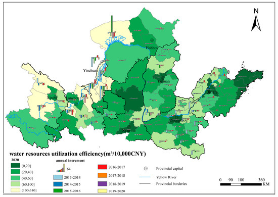Based on water consumption per unit of GDP, we analyzed the spatial patterns and changes in water use efficiency during the period from 2013 to 2020 (Figure 3). It can be found that cities situated downstream exhibited superior water use efficiency compared to those in the middle and upstream regions. Qingdao in Shandong Province was the city with the highest water use efficiency with its water consumption per unit of GDP less than 10 m3/10,000 CNY in 2020. Following closely behind were several provincial capital cities, including Taiyuan of Shanxi Province, Xi’an of Shaanxi Province, Jinan of Shandong Province, Zhengzhou of Henan Province, and some economic developed cities in east of Shandong Province, such as Weihai and Yantai, also demonstrated impressive water use efficiency with water consumption per unit GDP below 20 m3/10,000 CNY. On the other side, cities in upstream regions, particularly those along the main stream of the Yellow River, such as Yinchuan, Shizhuishan, Zhongwei in Ningxia, and Bayannur in Inner Mongolia, lagged behind with water consumption per unit GDP surpassing 100 m3/10,000 CNY [31]. A comparative analysis of water use efficiency among cities supplied by the DYR, MR-SNWTP, and ER-SNWTP revealed intriguing patterns. Cities serviced by the ER-SNWTP exhibited significantly lower water consumption per unit GDP than those relying on the other two water transfer projects. Cities receiving water from MR-SNWTP ranked second in terms of water use efficiency improvements. However, cities utilizing water from the DYR fell below the basin’s average level.