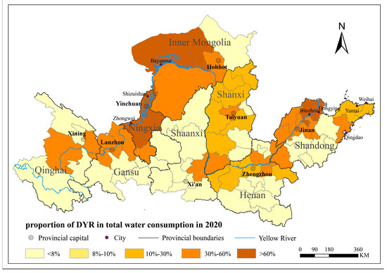 All provinces along the Yellow River withdraws water from its mainstream based on quotas assigned by the central government to meet the requirement of agricultural irrigation, and industrial and urban development [32]. In 2020, there were 50 prefectural cities involved. According to the absolute scale and the proportion of the DYR in the overall regional water consumption, it can be found that the city with the largest water diversion scale was Bayannur City, located in the northwest corner of the Yellow River’s inverted U-shaped bend, with the absolute scale of 4.812 billion cubic meters and the proportion of 74.6% in 2020 (Figure 4). However, the city with the largest proportion of the DYR in water consumption was Binzhou located at the Yellow River’s terminus, where it empties into the sea, with the proportion of 80.6% and 1.34 billion cubic meters of DYR water used. Further, four cities in upper stream of basin in Ningxia, including Yinchuan, Wuzhong, Zhongwei, and Shizuishan, and two cities in Inner Mongolia as Baotou and Wuhai, and Dongying in Shandong where the Yellow River meets the sea, all exhibited a total water consumption proportion exceeding 60% (as a percentage of its water received from the DYR).
