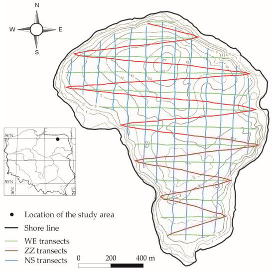 Field measurements were conducted from 21:57 to 01:34 using a Simrad EY500 with a 120 kHz frequency echosounder (Simrad A Konsberg Company, Bergen, Norway), which worked with a 4 × 10° elliptical transducer pointing vertically downward. The transducer was mounted on a special position-stabilizing frame. Since the short duration (“length”) of the pulse ensures very good vertical resolution [], during these tests, the pulses were 0.3 ms long and were sent at the maximum frequency. Hydroacoustic research was carried out at a speed of 8 km h−1 every night (on 21/22 June; 22/23 June; and 27/28 June 2016) along three types of transects (Figure 1):