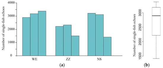 The number of single-fish echoes identified in individual studies ranged from 1417 to 3356 (Figure 2a). The variability in these results was very high; the coefficient of variation (CV) = 110%, but all values met the IQR criterion (on the boxplot chart, even the most extreme values were not marked as potential outliers (Figure 2b)). Student’s t-test did not confirm the existence of a statistically significant difference (p = 0.111) between the number of single-fish echoes recorded on zigzag transects (ZZ) and the number of fish echoes recorded on the remaining transects (WE and NS).