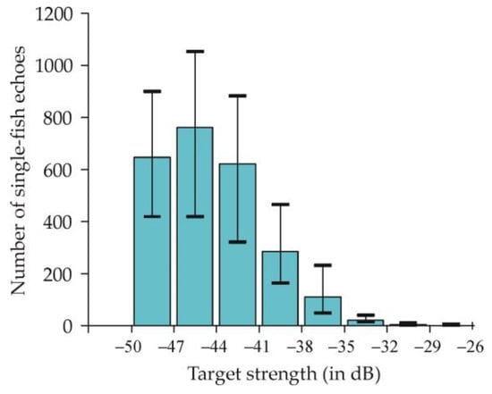 The skewness of the mean echo number distribution was 0.36, which indicated weak positive asymmetry (Figure 3). In all nine replicates, the peak echo number of individual fish was recorded in the range of –47 < TS < –44 dB. The share of fish with TS > −38 dB, i.e., the largest fish that are the target of fishermen, was very small and ranged within very narrow limits from 1% to 2%. It was therefore several times (4–8 times) smaller than the one recorded in 2021 in Lake Dejguny and over 12 times smaller than the one recorded in 2008 [].
