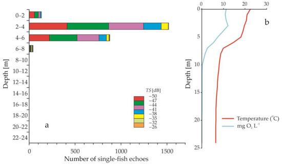 The TS distribution of single-fish echoes (average value from nine repetitions) in water layers at depths from 0 to 24 m (Figure 4a) was the result of changes in the concentration of oxygen dissolved in water (Figure 4b). Fish were concentrated in the upper layers of water (up to 8 m deep). The greatest number of fish (i.e., 62% of all detected) was recorded in the layer from 2 to 4 m and 36% of echoes were recorded at a depth of 4–6 m. In the remaining layers, there was a maximum of less than 5% (0–2 m), but with less than 8 m depth, with an oxygen concentration less than 1.4 mg L−1 (Figure 4b), and this accounted for only about 0.1%.