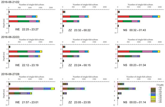 The variation in the TS distribution of single-fish echoes in profiles within individual types (WE, NS, and ZZ) from the nights of 21/22 and 22/23 June was relatively small (Figure 5). However, in this case, in the WE profile from 21/22 June, the maximum number of fish was surprisingly recorded in the 4–6 m layer, and not 2–4 m as in other profiles. However, greater differences occurred between individual types of transects. The number of fish in layer 4–6 in the ZZ and NS transects was 0.45 to 0.65 of the number of fish in the 2–4 m layer, while in the WE profiles it was 0.93 to 1.08. The greatest number of fish is usually recorded in the 2–4 m layer, but on the night of 21/22 June in the WE transects the greatest number of fish was recorded between a depth of 4 and 6 m (Figure 5). Very large differences were observed as a result of research conducted on the night of 27/28 June. Along the WE transects, the highest number of fish and the maximum number of fish in the 2–4 m layer and the maximum number of fish with TS in the range of −38 dB to −35 dB were recorded. However, later (between 11:05 p.m. and 01:14 a.m.) the maximum number of fish was found in the 0–2 m layer and the minimum number of fish was found in the 2–4 m layer.