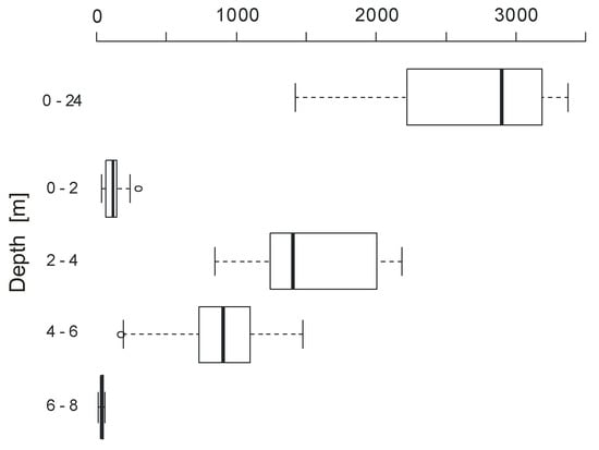 The graphs in Figure 5 show that the number of individual fish echoes recorded on transects ZZ 27/28 and NS 27/28 at night on 27/28 June between 23:05 and 01:14 was lower than on the other transects. However, the identification of outliers using the 1.5 × IQR rule showed that only two values (numbers of fish in layers 0–2 m and 4–6 m in the NS 27/28 profile) were greater or less than the upper or lower cutoff limits, respectively (Figure 6). Moreover, in the ZZ 27/28 profile, the number of fish in the 4–6 m layer was only 5% higher than the above-mentioned outlier in this layer from the NS 27/28 profile.