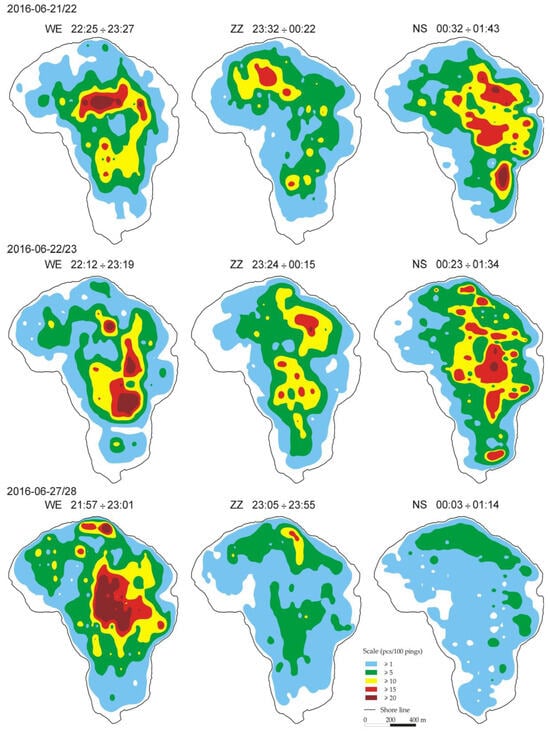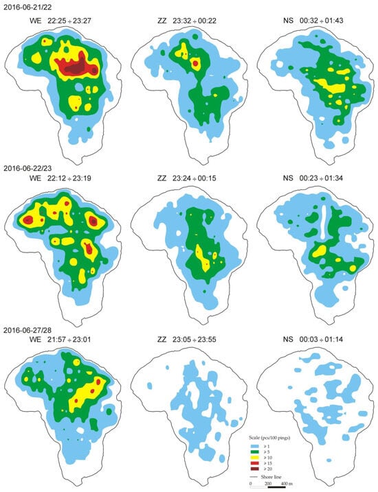Mapping the distribution of fish numbers in sections of 100 pings at a depth of 4–6 m in Lake Widryńskie on 21/22, 22/23, and 27/28 June 2016. WE—east–west transects; ZZ—zigzag transects; NS—north–south transects.