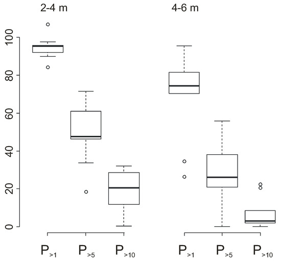 These findings are confirmed by the values of the coefficient of variation in the size of the area in layers 2–4 m and 4–6 m. The CV of the area in the layer 2–4 m, where the registration of fish (n > 1) could be expected, was 6.5%. According to the adopted grading scale, it can be concluded that the differences were relatively small. In the other two analyzed cases, i.e., for n > 5 and n > 10 fish, the CV was 34% and 63%, respectively, which indicated very high variability. In the 4–6 m layer, the CV values for n > 1, n > 5, and n > 10 were 32%, 71%, and 120%, respectively, so they were not only greater than 30%, a threshold value indicating very high variability, but also much higher than the CV values determined in the 2–4 m layer. This could be related to a much smaller number of fish detected during the research, which could have resulted in greater fish avoidance during the research.
