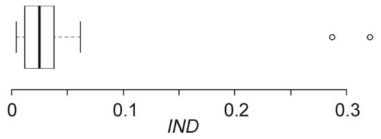 As already mentioned, the IND coefficient was modeled on the large fish indicator, which was developed by Greenstret et al. for use in the North Sea, and is the proportion of the total fish biomass of a given set of species in a given water body that exceeds a specified threshold length []. This indicator allows one to determine the diversity of the size and structure of specific fish communities and reflects changes in the population size and structure of individual species, as well as changes in the relative abundance of species with different body lengths []. The IND indicator proposed in the previous publication [] is based not on fish biomass but on the number of fish with a specific target strength, and its meaning is assumed to be identical to the large fish indicator. It was concluded that the large fish indicator, which effectively shows the disproportionately increased relative abundance of smaller fish compared to larger individuals, may be a good metric for assessing “the ecological status (“health”) of fish communities” [], especially those that are influenced by fisheries with strong size-selective pressures, resulting in high mortality rates among larger fish []. However, it can be assumed that this metric of size composition will be equally effective in assessing changes in the structure of fish communities that are caused by other reasons.
