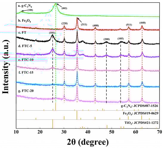 Figure 1 shows the XRD patterns of Fe3O4, FT (Fe3O4@TiO2), and FTC (Fe3O4@TiO2/g-C3N4). According to Figure 1a, the diffraction peaks at 12.8° and 26.6° correspond to the (100) and (002) planes of g-C3N4 (JCPDS 87-1526) [], while the peaks at 30.0°, 35.5°, 43.1°, 56.9°, and 62.6° in Figure 1b are attributed to the (220), (311), (400), (511), and (440) planes of Fe3O4 (JCPDS 19-0629). After coating the TiO2 (Figure 1c), some new characteristic peaks appeared at 25.3°, 47.9°, and 54.9°, corresponding to the (101), (200), and (105) planes of anatase phase TiO2 (JCPDS 21-1272), which means that Fe3O4@TiO2 microspheres were synthesized successfully. As illustrated in Figure 1d–g, the peak positions of the FTC samples are similar to the FT, except that the peak intensity of TiO2 and Fe3O4 slightly decreases from FTC-5 to FTC-20. Additionally, due to the low crystallization and content of g-C3N4, its diffraction peak is not obvious in the FTC-5 and FTC-10 samples, but weaker peaks can be found in the FTC-15 and FTC-20 samples, proving that g-C3N4 exists. These results suggest that the Fe3O4@TiO2/g-C3N4 photocatalyst has been successfully synthesized.