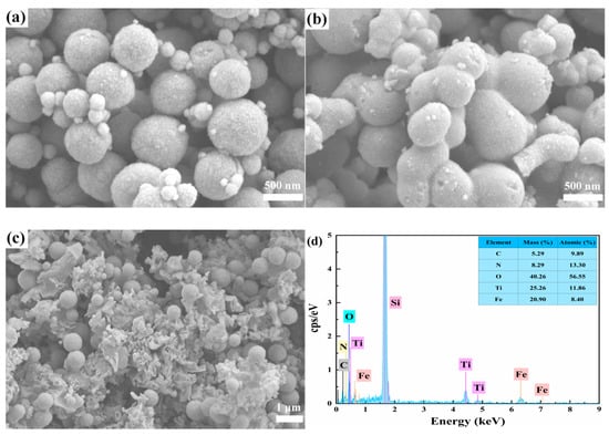 Figure 2 presents the morphology and composition of Fe3O4, FT (Fe3O4@TiO2), and FTC-15 (Fe3O4@TiO2/g-C3N4). As shown in Figure 2a, the Fe3O4 sample exhibits a well-dispersed microsphere morphology with a rough surface and an average diameter of about 200 nm. After coating with TiO2, the FT sample still maintains a spherical morphology, but its surface becomes smooth (Figure 2b) [,,]. After the further introduction of g-C3N4 (Figure 2c), extensive layered sheets appeared around the FT microspheres, indicating that FTC-15 has been successfully obtained, which is further demonstrated by the EDS spectrum in Figure 2d. Apart from the Fe, O, and Ti elements, C and N elements can be clearly observed in the FTC-15 composite. Here, a strong Si element peak signal originates from the silicon substrate. In order to further explore the elemental distributions, EDS mapping images of Fe, O, Ti, C, and N elements in FTC-15 are shown in Figure 3. It can be seen that each element is uniformly dispersed in the FTC-15, which aligns with the SEM and XRD results.