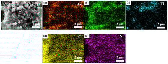 EDS mapping images of (a) Fe, (b) O, (c) Ti, (d) C, and (e) N elements in FTC-15 sample.