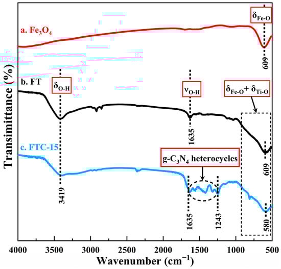 Figure 4 exhibits the FT-IR spectra of the different samples. For the Fe3O4 sample (Figure 4a), a Fe-O bond stretching vibration appeared at 609 cm−1 []. For the FT sample, some absorption peaks appearing at 3419 and 1635 cm−1 in Figure 4b correspond to O-H bond vibrations, and the absorption peak at 609 cm−1 becomes stronger and wider, which may be caused by the overlapping stretching vibrations of the Ti-O and Fe-O bonds since their absorption peak positions are close to each other []. For the FTC-15 sample, some new absorption peaks appear between 1243 and 1635 cm−1, which may be attributed to g-C3N4 heterocycle stretching vibrations (Figure 4c) []. Moreover, compared with the FT sample, the absorption peak at 609 cm−1 in the FTC sample shifts to 580 cm−1, suggesting an interaction between TiO2 and g-C3N4, which is related to the enhanced photocatalytic activity.