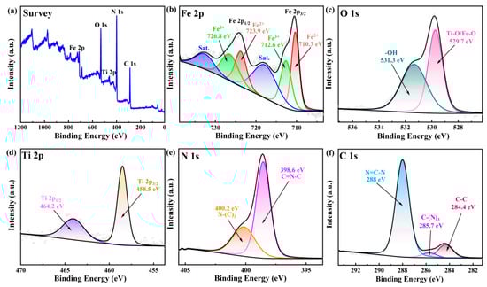 XPS spectra of FTC-15: (a) survey spectra, (b) Fe 2p, (c) O 1s, (d) Ti 2p, (e) N 1s, and (f) C 1s.