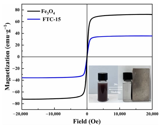 The magnetic hysteresis curves of the Fe3O4 and FTC-15 samples were measured by VSM. As shown in Figure 7, all the samples exhibit super-paramagnetic features with negligible residual magnetization (Mr) and coercivity (Hc). The magnetization saturation (Ms) value of pure Fe3O4 is 72.14 emu·g−1. After further coating, the Ms value of the FTC-15 sample is reduced to 35.73 emu·g−1, which is mainly due to the low mass fraction of Fe3O4 in the FTC-15. This phenomenon has also been found in a previous report []. In addition, as shown in the right corner of Figure 7, FTC-15 can be rapidly separated under an external magnetic field within 30 s. This excellent magnetic feature provides a straightforward method for separating and recycling FTC-15 photocatalysts from reaction solutions.