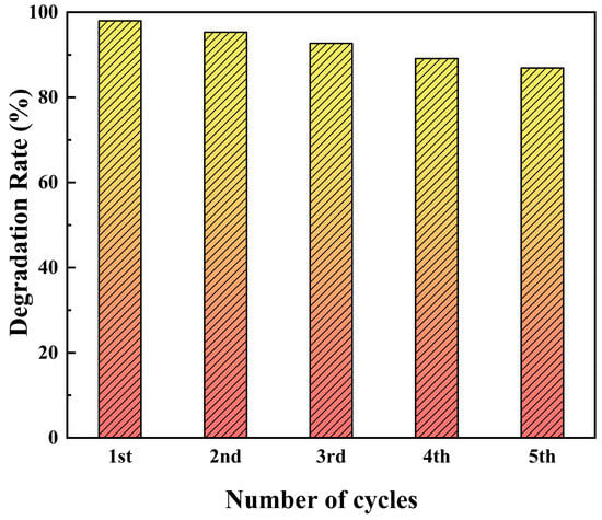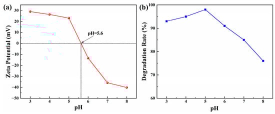 Figure 8 shows the surface charge properties and TC degradation rate of FTC-15 under different pH conditions. As shown in Figure 8a, the Zeta potential value of FTC-15 gradually decreases with increasing pH and reaches the zero point charge (ZPC) at pH = 5.6. The FTC-15 surface is positively charged when the pH value is less than 5.6, and negatively charged when the pH value is more than 5.6. As shown in Figure 8b, the TC degradation rate presents a trend of first increasing and then decreasing as the pH value increases, and it reaches the maximum value when pH = 5. When the pH value is between 3 and 4, the TC exists as TC-HCl0 and TC-HCl+, which are repulsive to the positively charged FTC-15, thus affecting the photocatalytic degradation process []. When the pH value reaches 5, the TC exists as TC-HCl0 and TC-HCl−, so a weak electrostatic adsorption force is generated between the TC-HCl− and FTC-15, thus accelerating the TC degradation process []. When the pH value is between 6 and 8, the TC mainly exists as TC-HCl−, so electrostatic repulsion occurs again between TC-HCl− and negatively charged FTC-15, weakening the TC degradation process. Considering that the initial pH value of the TC solution is about 5.1, the pH adjustment is eliminated during the subsequent degradation process.