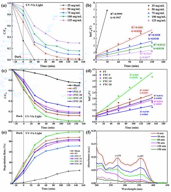 In order to investigate photocatalytic performance, photodegradation experiments were conducted. As shown in Figure 9a,b, photocatalytic degradation efficiency gradually decreases when increasing TC concentration. When the initial concentration is 25 mg/L, TC is completely degraded within 30 min, which is unsuitable for the subsequent kinetics due to the short time. When TC concentration increases from 50 mg/L to 125 mg/L, the reaction rate decreases from 0.024 min−1 to 0.0077 min−1, and this long reaction time is also not conducive to further performance study. Therefore, 50 mg/L is chosen for the subsequent experiments. As presented in Figure 9c, the TC degradation rate is extremely slow without a photocatalyst present, indicating the high chemical stability of TC. After adding FT and FTC photocatalysts, the TC content slightly decreased after stirring in a dark condition for 30 min, due to the adsorption effect caused by abundant pore structure in the photocatalysts. Furthermore, it can be observed that the TC content shows a rapid downward trend under UV–Vis irradiation. As the g-C3N4 content in the FTC photocatalyst increases from 5% to 15%, the TC degradation rate gradually increases and is better than with FT, which may be related to the heterojunction structure between TiO2 and g-C3N4. However, when the g-C3N4 content reaches 20%, the TC degradation rate decreases slightly, which may be attributed to the excessively layered g-C3N4 deposited on the TiO2 surface, forming a thick and relatively tight coating, which blocks some pores and prevents the active catalytic site on the TiO2 surface from fully contacting the TC molecules, thereby adversely affecting the photocatalytic degradation reaction [,]. Also, the half-life period of TC during photocatalytic degradation by FT is estimated to be 38.72 min, while it is reduced to 25.13 min by FTC-15, which suggests that g-C3N4 can largely promote the degradation process.