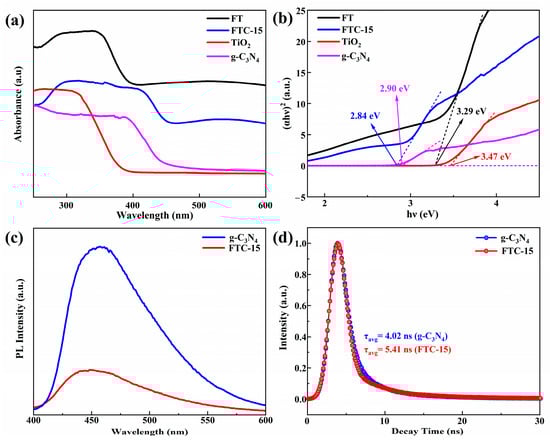 (a) UV–Vis diffuse reflection spectra and (b) plots of (αhv)2 vs. photon energy (hv) of FT, FTC-15, TiO2, and g-C3N4 samples; (c) PL spectra and (d) TRPL decay spectra of g-C3N4 and FTC-15 samples under 343 nm excitation.